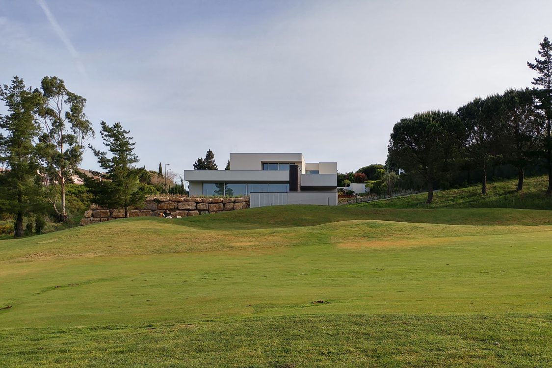 O lote situa-se no condomínio Belas Clube de Campo, fazendo a ligação entre a rua e o campo de golfe. Tendo em consideração a forte pendente desta encosta, tentou-se “encaixar” a casa no terreno por forma a termos algum equilíbrio ao nível de cérceas. Pretende-se ainda que a casa tenha uma relação muito forte com a envolvente exterior, possibilitando ao máximo o usofruto do espaço verde e a relação franca e ampla com a paisagem a sul.