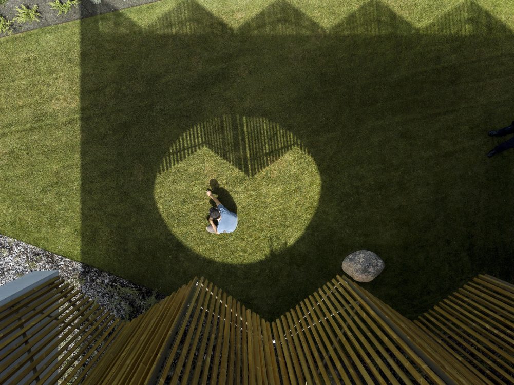 A norte, uma circunferência vazada à laje de cobertura quebra a linearidade do edifício, constituindo um elemento especial e de excepção ao permitir que uma luz em foco de posição mutável trespasse o logradouro entre a fachada do edifício e a sua “pele”.