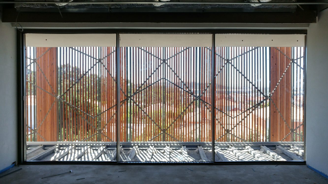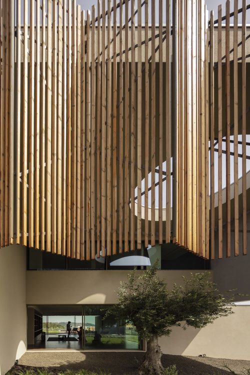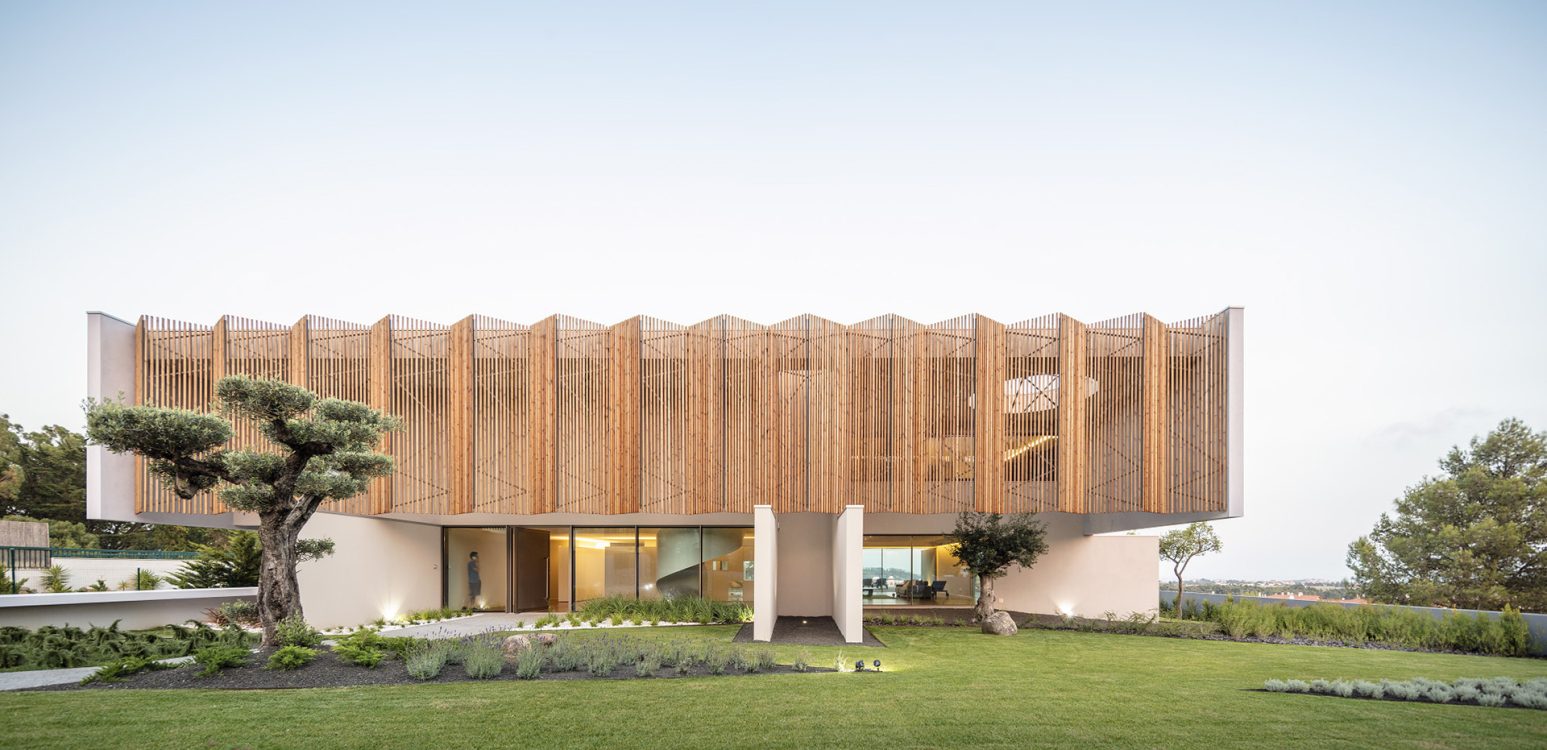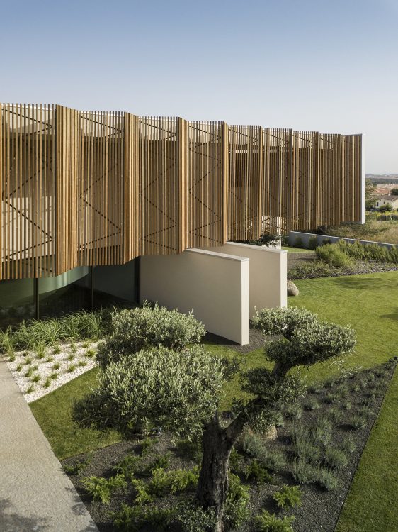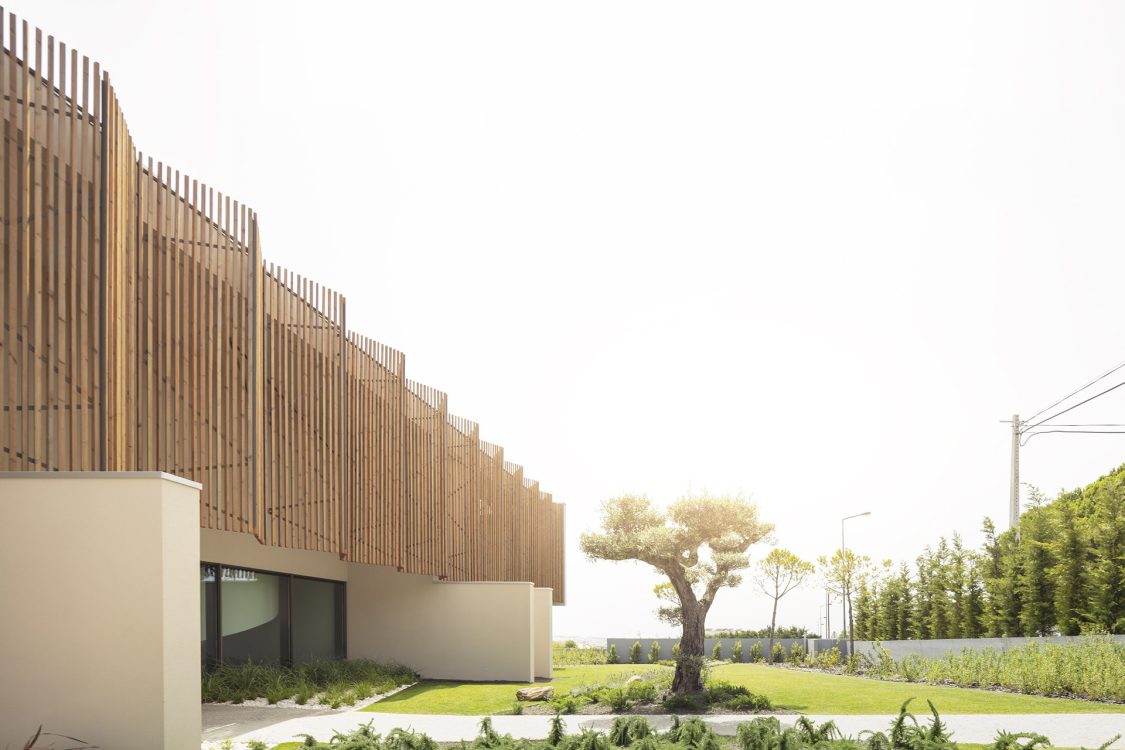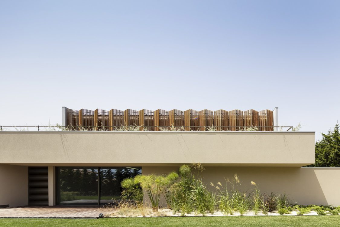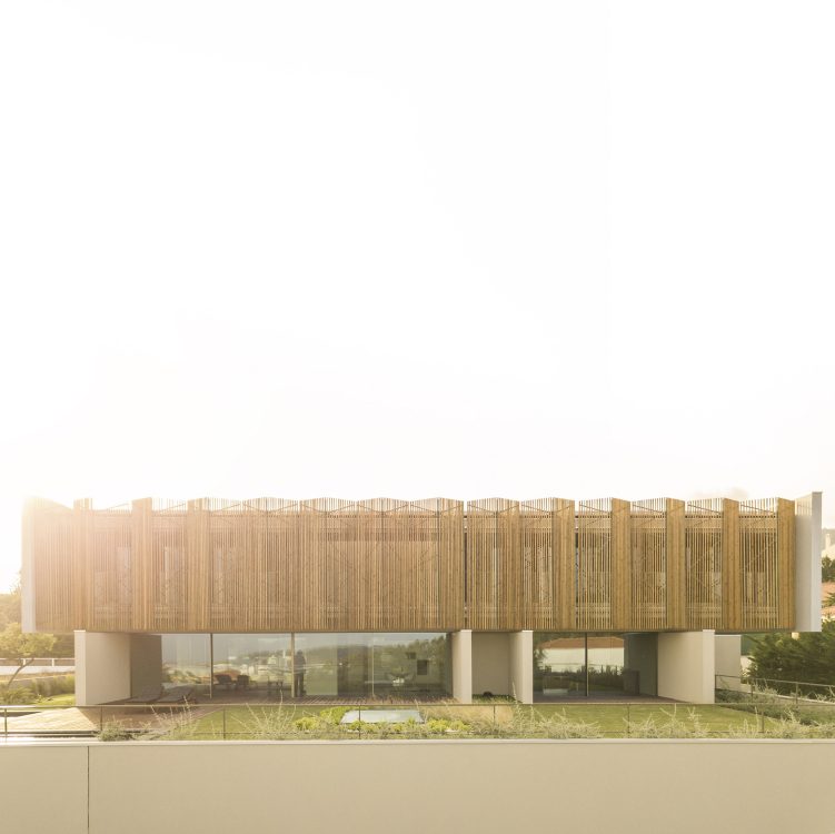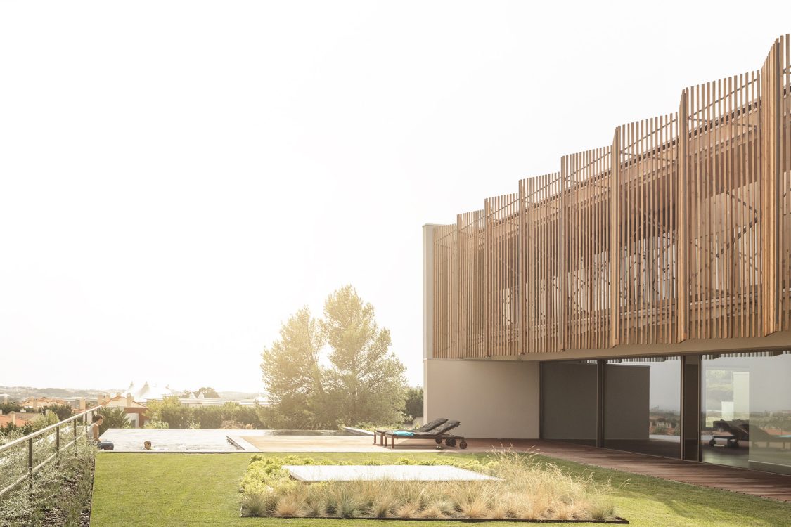 A Norte e a Sul, ao nível do piso 1, um extenso ripado de madeira, estruturado por um engenhoso sistema de treliças, ora fixo ora rebatível, funciona como uma pele semi-transparente que assegura a privacidade dos quartos, enrriquecendo-os com uma luz indirecta e filtrada.