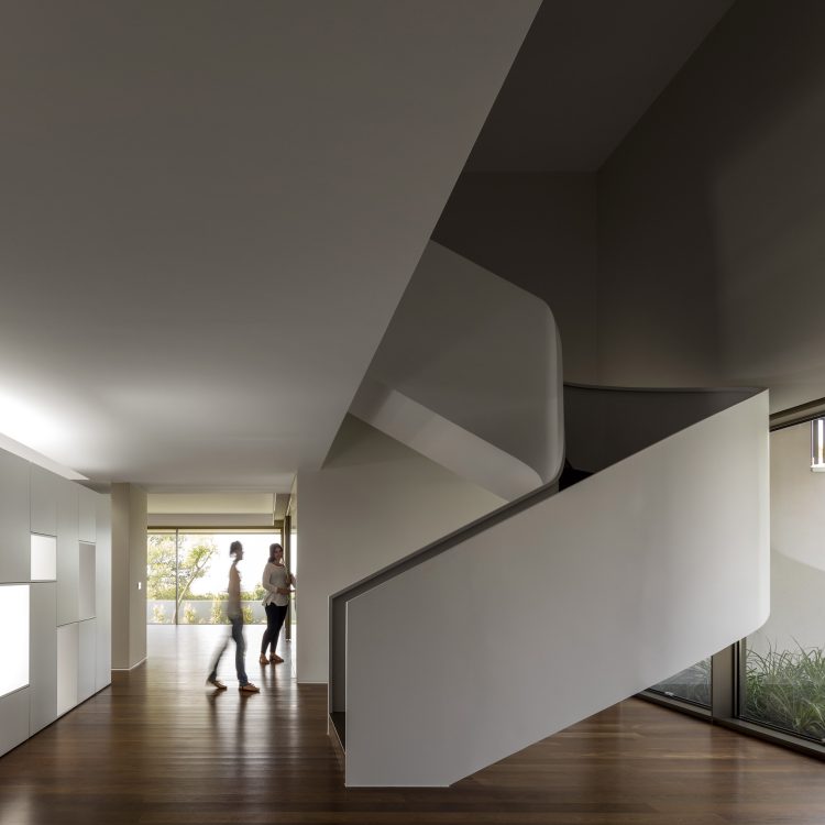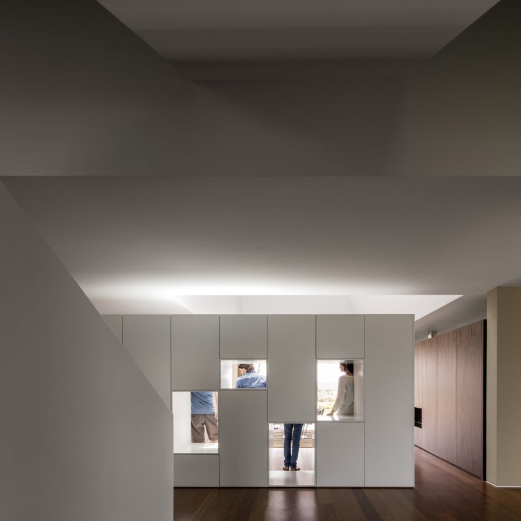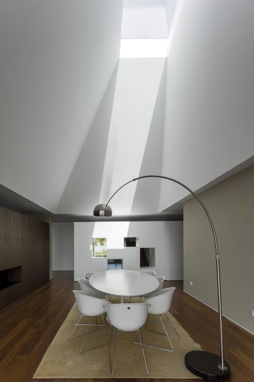 No piso 0, largos vãos rasgam a fachada, permitindo a leitura contínua entre paredes interiores e exteriores, quando estas se prolongam para lá dos limites do edifícios e trazem os espaços verdes para dentro de casa. Exteriormente, estas paredes funcionam como muros de suporte do limite do piso superior, face ao qual as paredes recuam ou avançam conforme os diferentes níveis de privacidade do programa. Na sala de jantar, o pé-direito do piso 0 é interrompido por uma chaminé que afunila todo o perímetro da sala para uma clarabóia de pequenas dimensões, escoando uma grande quantidade de luz natural através das suas enormes paredes, convidando o céu a sentar-se à mesa.