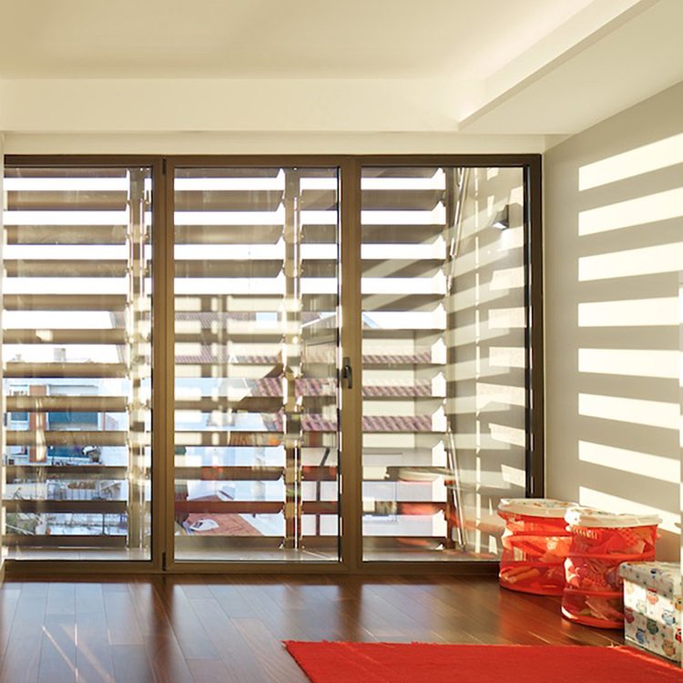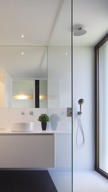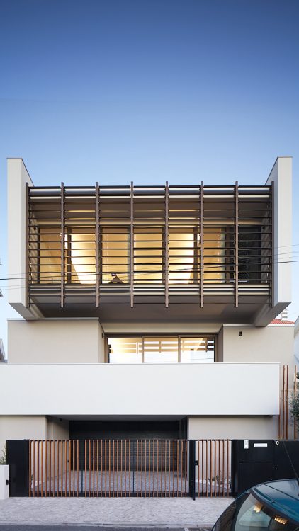 No piso 1 a suite orientada a Nascente é beneficiada pela existência de um jardim no topo do lote, conferindo ao espaço interior um carácter térreo e de grande conforto. No mesmo piso, a Poente, os vãos dos outros dois quartos são protegidos por um Bric-de-soleil de lâminas direccionáveis que assegura a privacidade e o sombreamento dos espaços sem comprometer a sua relação com o exterior.