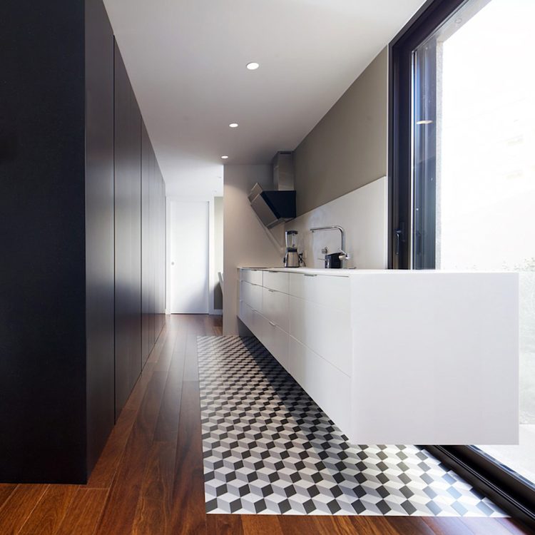 O piso térreo condensa a garagem, as zonas de serviço e o hall de entrada no edifício, apartir do qual umas escadas nos conduzem ao piso social onde a sala, a cozinha e uma zona de escritório, apenas separados por uma parede, partilham o mesmo espaço e usufruem da luz dos mesmos vãos.
